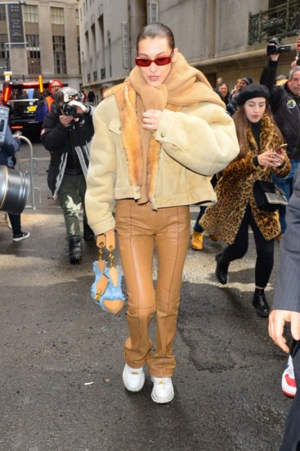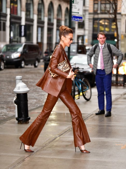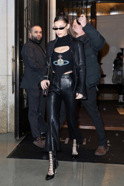 Еще один модный прием из 1990-х годов, который выбирает Белла – кожаные брюки, блейзеры и плащи. В streetstyle-образах Хадид часто преобладают именно кожаные изделия черных и карамельных оттенков, причем как total-leather образы, так и отдельные элементы из кожи, которые Белла искусно комбинирует с другими элементами гардероба.