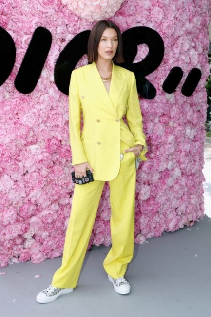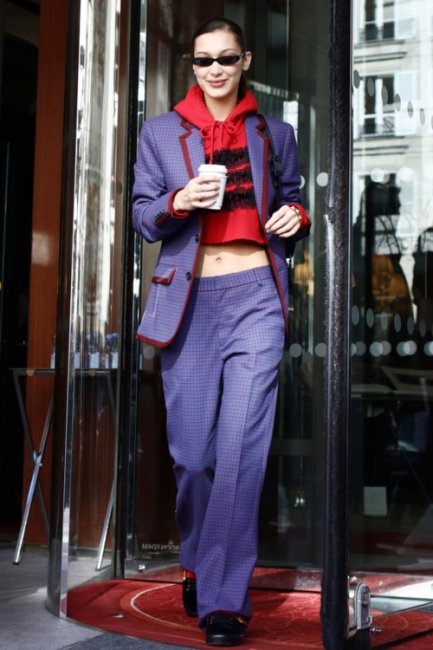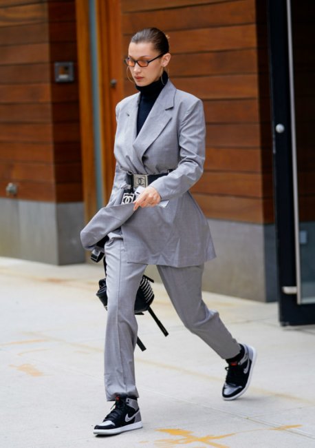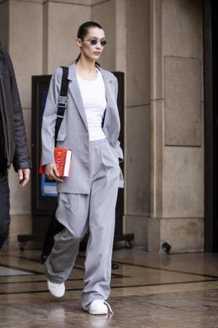 Младшая сестра Джиджи Хадид также любит разбавлять классические брючные костюмы всевозможными спортивными деталями. Это могут быть массивные кроссовки, базовые белые майки, кроп-топы из нулевых или объемные худи. На Белле такая комбинация вещей выглядит непринужденно и стильно.
