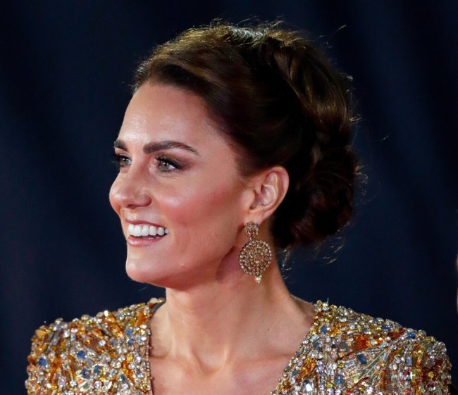 Принцесса Диана, 1987Кэтрин, герцогиня Кембриджская28 сентября 2021 года герцогиня Кембриджская стала настоящей звездой на красной дорожке фильма "Не время умирать". Ее золотое искрящееся платье Jenny Packham идеально подчеркивало точеную фигуру герцогини. Дополнили образ крупные серьги.