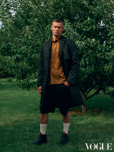 Пальто из нейлона, Nanushka; хлопковая рубашка, JW Anderson (tsum.ua)Они – настоящие инфлюенсеры с 400 тысячами подписчиков на двоих в Instagram. Михаилу присуща самоирония: плавки с леопардовым принтом, которые он принес на прошлую съемку для апрельского Vogue Man UA, «сделали» кадр; Марина по-настоящему увлечена модой и любит шопинг – говорит, часто бывают с мужем в ЦУМе.