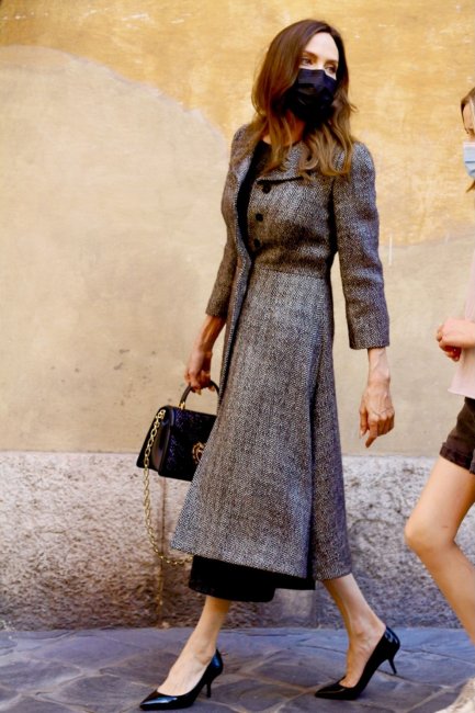 Анджелина ДжолиТакже во время поездки в Рим Анджелина Джоли примеряла винтажное пальто Dolce & Gabbana из коллекции осень-зима 1998/99. Оно выполнено из серой буклированной шерсти, дополнено укороченным рукавом, а приталенный силуэт с легким клешем делает его похожим на элегантное платье. Аксессуары для этого образа актриса также выбрала классические – туфли-лодочки на небольшом каблуке и сумку Dolce & Gabbana 'Devotion'.