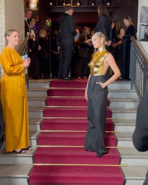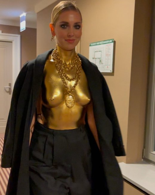 На церемонию награждения GQ Woman of the Year в Берлине Кьяра Ферраньи надела топ-кольчугу Schiaparelli, который с фотографической достоверностью воспроизводит очертания, форму и рельеф женской груди и даже пирсинг соска.