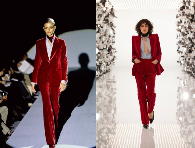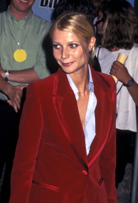 Гвинет Пэлтроу, 1996Итальянский дизайнер включил его в коллекцию, посвященную 100-летнему юбилею Дома. Причем, Гвинет Пэлтроу не просто снова надела этот костюм, но и повторила другие детали образа – под низом также выглядывала глубоко-расстегнутая светло-голубая сорочка, а волосы были небрежно собраны внизу. Внешне актриса за это время также практически не изменилась – стройная фигура, лучезарная улыбка и золотистые локоны средней длины и сегодня остаются с ней.
