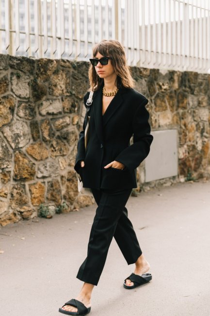 Брючный костюмФото: DIEGO ANCIANOТемный брючный костюм ассоциируется с формальностью, некой строгостью и, конечно, негласной классикой. Смягчить образ помогут расслабленные аксессуары: крупные цепи, сумки на коротком ремешке и солнцезащитные очки.