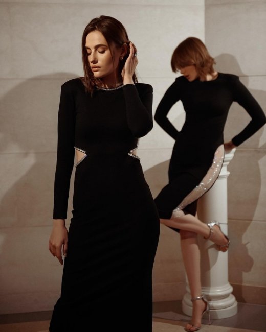 A.M.G.Украинский бренд A.M.G. просто обожает первая леди Елена Зеленская, которая нередко выбирает его платья-футляры, юбочные двойки и пальто. Однако Алена Беттяр известна не только искусной работой с формальной одеждой, но и одними из самых красивых вечерних платьев. Так, в коллекции сезона весна-лето 2022 она представила на первый взгляд простой, но очень эффектный образ – черное платье в пол с круглым вырезом на бедре, декорированном кристаллами. Остаться незамеченной невозможно.