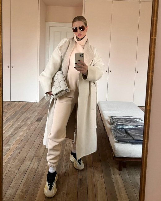 Рози Хантингтон-УайтлиСпортивный костюм The BazilikaИгра пропорций и силуэтов, а также сочетание спортивных вещей с классическими деталями - любимый стилистическим прием Рози Хантингтон-Уайтли, который она использует и во время беременности. Так, объемных верх она часто комбинирует с узким низом, а джоггеры и худи надевает с женственными пальто на запах. Ниже вы можете увидеть пример идеального зимнего образа, в котром можно уверено провести целый день на ногах: костюм объемного кроя The Bazilika, молочное пальто Marcela London, кроссовки Yeezy и сумка с крупным плетением Bottega Veneta. Завершите свой выход очками в стиле Рози Хантингтон-Уайтли.