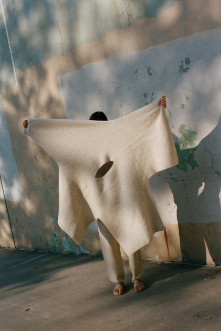 Лорен говорит, что дизайн трикотажа напоминает ей занятие скульптурой — задавая материалам определенные технические свойства, можно играть с их пластичностью и контролировать, как они будут вести себя на теле. На создание подкупающе простых форм ее вдохновляют художники — я вспоминаю об аскетичных фетровых работах Йозефа Бойса и макабрических текстильных скульптурах Луизы Буржуа. Мануджиан продолжает список: ей нравятся скульптуры-паутины Евы Гессе; «карабкающиеся» по стенам, исчерченные полотна Агнес Мартин; собранные из подручных материалов скульптуры Ричарда Таттла; традиционный текстиль и гончарное ремесло американского Юго-Запада.