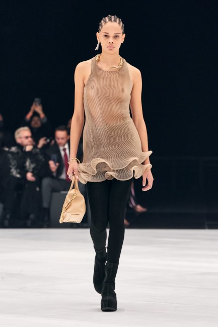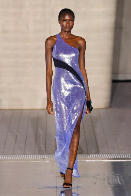ValentinoAlexander McQueenDavid Koma продемонстрировали свою интерпретацию на главный цвет этого года по версии Pantone - Very Peri. Лиловое макси-платье с разрезом, усыпанное пайетками, - пожалуй, лучший вариант для романтичного образа. За моделью в базовом нюдовом оттенке советуем обратиться к Givenchy. Бренд стилизовал платье с леггинсами и полусапогами на платформе.