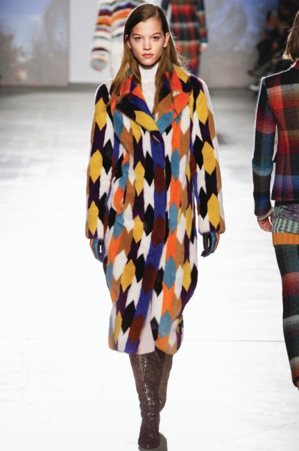 Тренд для тех, кому просто цветная шуба кажется слишком скучной. Дизайнеры предлагают варианты с разнообразными узорами — от элементарных геометрических фигур до сложных рисунков. Причем это не принты, а модели, собранные из разноцветных мехов, по технике напоминающие знаменитый пэтчворк.