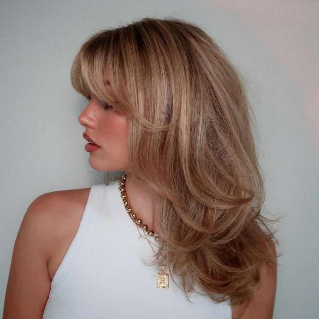 Гибрид из стрижки Рейчел и челки Бриджит Бордо. Многослойная стрижка и удлиненная челка-шторка, обрамляющая лицо, скрывают возрастные изменения, делают черты лица мягче, даже маскируют брыли. Стрижка добавляет весомый объем волосам, показана для тонких прядей.