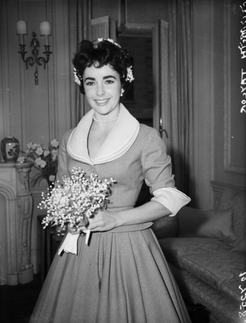 Свадьба Элизабет Тейлор и Конрада Хилтона, 1950Всего через два года Тейлор снова вышла замуж. Ее избранником стал английский актер Майкл Уилдинг, который был на 20 лет старше невесты. Для создания свадебного образа Элизабет снова обратилась к Хелен Роуз, но в этот раз решив пойти против традиций. Так, Тейлор выбрала элегантный костюм, состоящий из приталенного жакета с отложным воротником и юбки А-силуэта. Невеста отказалась от вуали в пользу цветов в ее волосах, а также дополнила образ скромным жемчужным ожерельем.