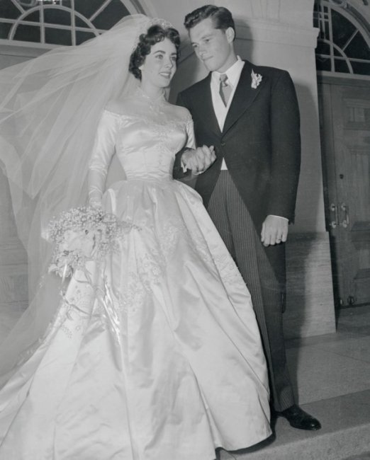 Свадьба Элизабет Тейлор и Конрада Хилтона, 1950Первая свадьба юной Элизабет Тейлор состоялась 6 мая 1950 года. Девушка вышла замуж за Конрада «Ники» Хилтона в церкви Доброго Пастыря в Беверли-Хиллз. Актриса выбрала белое свадебное платье, выполненное в лучших традициях свадебной моды - пышная юбка, узкая талия, длинный рукав и декольте, инкрустированное жемчугом. Свадебное платье для Элизабет Тейлор разработала известный дизайнер Хелен Роуз, которая также создала подвенечный наряд для Грейс Келли. На изготовление свадебного платья понадобилось три месяца и 15 швей. Наряд был продан на аукционе в 2013 году за 122000 фунтов стерлингов.
