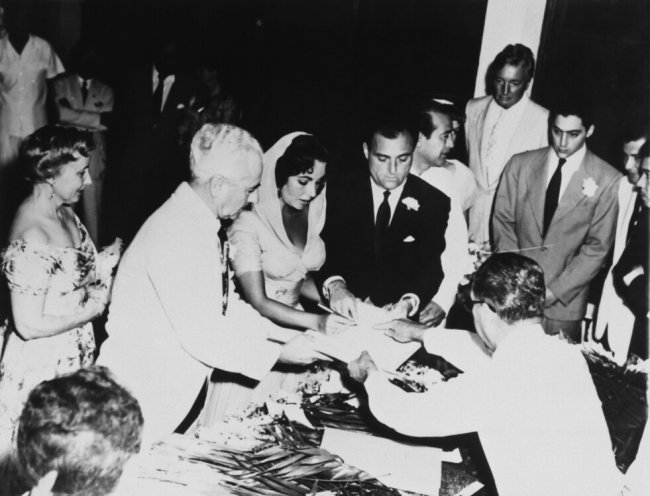 Свадебный образ Элизабет Тейлор, 1952Однако именно по случаю ее третьего брака с Майком Тоддом в 1957 году, Тейлор проявила признаки драматической дивы, которые с тех пор стали ее наследием. На свадьбе в мэрии в Мексике Элизабет была одета в белое шелково-шифоновое платье с эффектным широким капюшоном, вместо традиционной фаты. Однако самым ярким элементом ее образа было ее обручальное кольцо с бриллиантом изумрудной огранки в 29,9 карат.