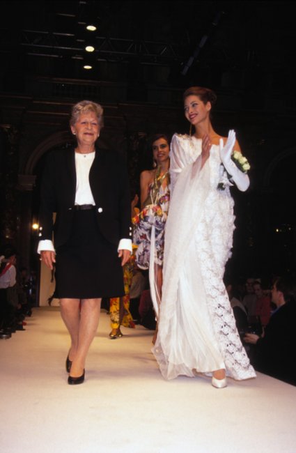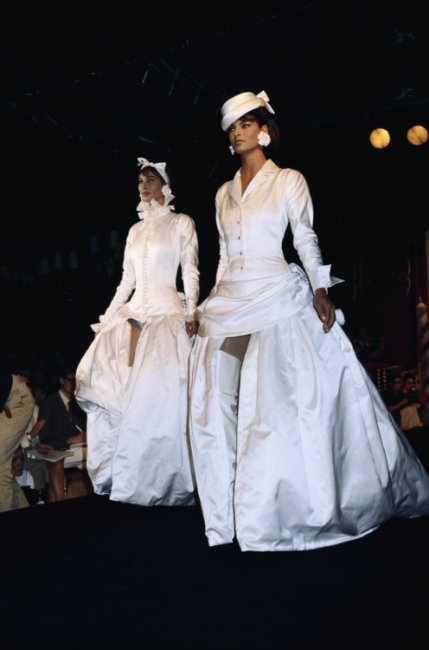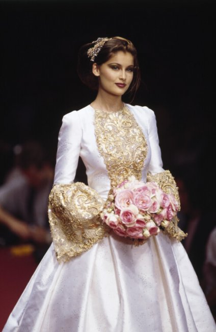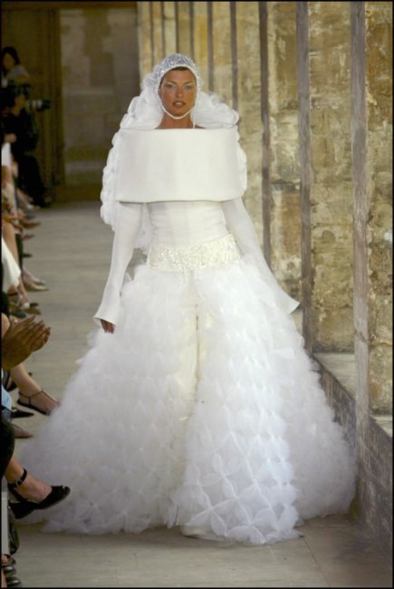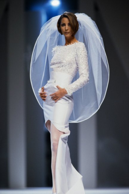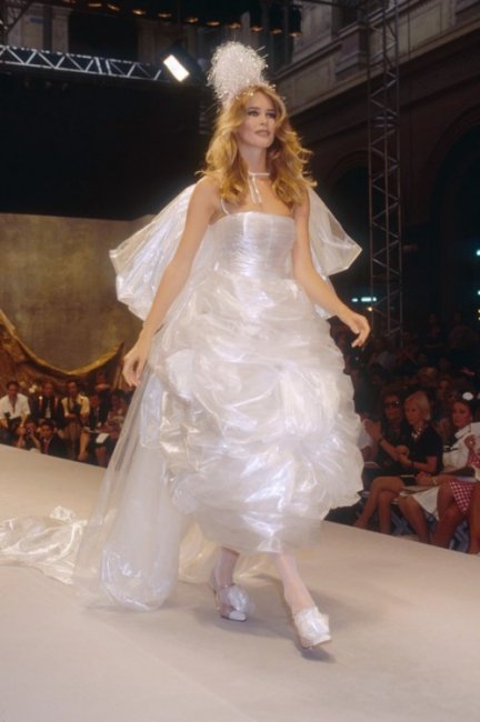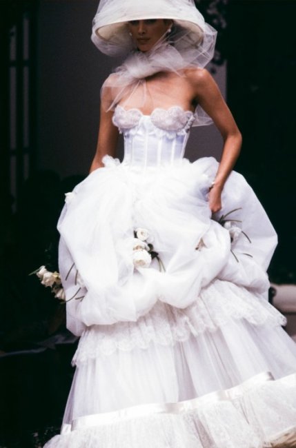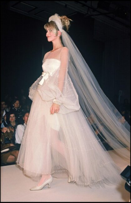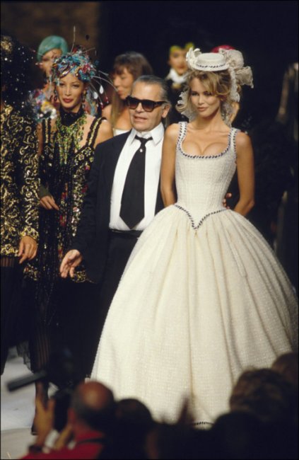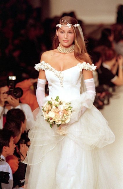 Клаудия Шиффер была любимой моделью и музой Карла Лагерфельда в 1990-х. Легендарный кутюрье заметил Шиффер еще в начале ее модельной карьеры и с тех пор их союз продлился 7 лет, а дружба до конца жизни дизайнера. Клаудия всегда закрывала показы Chanel в потрясающих свадебных платьях. Так, в 1991 девушка дефилировала в полупрозрачном белом платье с пышными рукавами, обрамленное изящными нитями жемчуга, в 1993 году надела свадебное платье из макраме, а в 1995 примеряла пышный наряд из твида.