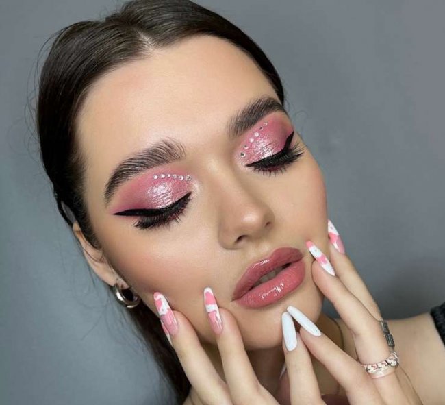 Визажист Марина Гуторова рассказывает и показывает, какие образы будут актуальны для главной ночи года Какой макияж будет актуален в эту новогоднюю ночь?Фото автораКаждая девушка мечтает быть неотразимой в самый волшебный и любимый для многих праздник — Новый год. Одной из главных составляющих новогоднего образа является макияж. Даже самое красивое платье не спасет ситуацию, если не будет качественного, правильного мэйкапа. Сегодня мы с визажистом и стилистом по волосам Мариной Гуторовой раскроем 8 лучших идей модного новогоднего макияжа и покажем, каким он должен быть. Эти образы не оставят вас равнодушными. Важно учесть, что новогодний макияж должен сочетать в себе роскошь вечернего мэйкапа, а также выражать праздничное настроение его обладательницы в полной мере. Это подразумевает использование в красивом мэйкапе на Новый год множество блесток и сверкающих элементов. Читайте также - Для того, чтобы поднять настроение и зарядиться положительной энергией на целый день рекомендуется смотреть красивые картинки, поделки и многое другое. Королевский немецкий дог посмотреть. Новый Год 2023 — это год Кролика. Значит, и макияж стоит подобрать с элементами холодных оттенков или металла. При этом в тренде и нюд, и арт. Основное направление в новогоднем макияже — бронза, коричневый, персик и песок. Но и яркие цвета также приветствуются: весь спектр зеленого, синего, фиолетового, розового. Также в моде остаются довольно грубые стрелки с цветным оформлением. В Новый год можно и пошалить: пайетки, стразы, камни, рисунок. Кролик одобрит такой креатив, и праздник пройдет на славу, зарядив вас и вдохновив на свершения в 2023 году. 1. Сияющая кожа Сияющая кожа - залог успеха любого праздничного макияжаФото автораНи для кого не станет открытием, что ключевой момент любого мэйкапа — это тон. Ваш макияж станет абсолютно трендовым, если вы создадите тон с красивым сиянием и эффектом влажности на коже лица и декольте. Добиться такого финиша можно с помощью базы и тональной основы, чтобы на коже появился естественный блеск. База создает основу для идеально ровного и стойкого тона. Она скрывает мелкие дефекты, закрывает поры и разглаживает морщинки. Для каждого типа существует свой инструмент. Для жирной кожи необходимо выбрать базу с матирующим эффектом, который усилит стойкость вашего тона. Для сухой — увлажняющая база с эффектом деликатного сияния, чтобы исключить появление кремовых «царапок» и чешуек. Для комбинированной подойдет универсальная база. Главное условие для тональной основы — абсолютное совпадение с натуральным оттенком кожи. Не темнее, не светлее. Иначе лицо будет напоминать маску из японского театра. Важным этапом идеального тона являются консилер и корректор, которые маскируют дефекты: мелкие покраснения, темные круги под глазами. Тональный крем не справится с такими неприятностями, а вот эти средства удачно скроют все проблемы кожи. Создать правильные объёмы и тени на лице вам поможет контуринг. Конечно, можно обойтись и без него, но тогда лицо будет плоским. Для каждого типа лица подойдет свой шаблон контуринга, который поможет подчеркнуть достоинства и скрыть недостатки. 2. Больше блесток Встреча Нового года – идеальный повод добавить мерцание в макияж глазФото автораВстреча Нового года — идеальный повод добавить в м