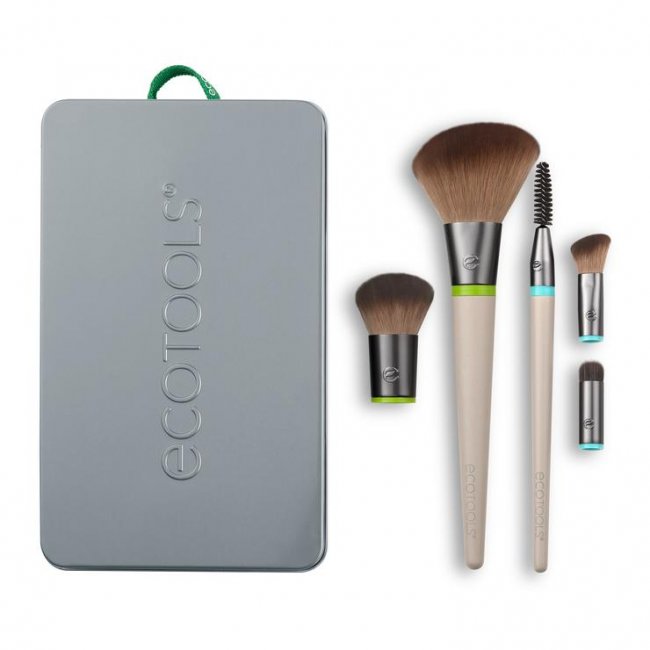Какую выбрать форму кисти — ваше личное решение. Но в тренде сейчас — плоские кисти для нанесения тональной основы. В новой коллекции американского бренда EcoTools под названием Interchangeables можно найти как раз такую плоскую кисть. А можно купить сразу целый набор, который позволит с легкостью комбинировать кисти. Дело в том, что бьюти-бокс составлен таким образом, можно ручки можно использовать с любыми сменными насадками. Они надежно крепятся к основанию кисти и легко заменяются в процессе создания макияжа. По цвету ободка можно подобрать подходящую насадку: у ручек меньшего диаметра — голубой ободок, а у ручек большего — зеленый.