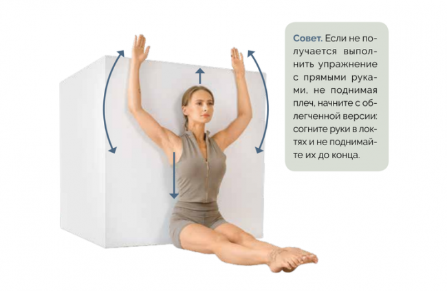 4. Оставаясь в этом положении, попробуйте поднять руки вверх — так, чтобы корпус оставался неподвижным. Смотрите в пол.